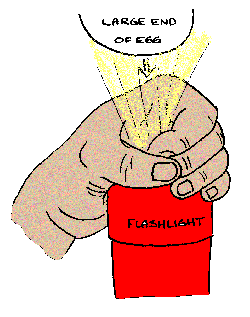 Eggs are candled by placing them up against a light source so you can see inside. It should be done in a darkened room and requires no special equipment. A flashlight can be turned into a 'candler' simply by cupping your hand around the beam so your thumb meets your fingers and an egg-shaped opening somewhat smaller than the egg is made. Place the egg on the circle made by your thumb and fore-finger so the light from the flashlight shines through the egg with you looking at the other side. It will not be possible to see much detail, but you will be able to determine if the egg is developing normally.