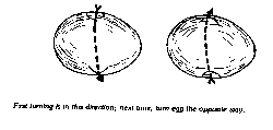 A setting duck instinctively shuffles and shifts her position on average about once every 20-35 minutes, thereby rolling the eggs around. As the eggs under a duck are seldom uniformly warm, she will shift the cooler eggs from the outside of the clutch towards the inside and the warmer ones towards the outside. Eggs in an incubator should be turned AT LEAST twice a day. The eggs are usually marked (in pencil) with an 'X' on one side and an 'O' on the other so it is easy to keep track of which eggs have been turned. They should be turned 180 degrees each time so the side that was on top becomes the bottom and vice-versa. If possible the eggs should be turned an odd number of times each day (like 3) so that the sides alternate being 'up' during the night. Insufficient or inconsistent turning in the early stages may cause the yolk to stick to the shell which often results in the death of the embryo. Improper turning in the later stages may result in ducklings being born with deformed feet and legs (they seem to need the exercise). If you are setting freshly laid eggs, do not set cold eggs directly in the incubator. Allow them to warm up at least to room temperature overnight before putting them in the incubator. It may even help to let them warm up further in sunlight for an hour or so just before setting them. The eggs should not be turned for the first 24 hours after being set in the incubator and you can stop turning them once they pip. Most sources say it is not necessary to turn the eggs for the last 1-2 days before hatching, but we have found that continuing to turn the eggs until they have actually pipped (or until you know they have broken into the air sac) results in a higher percentage of healthy ducklings.