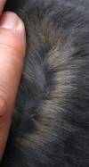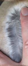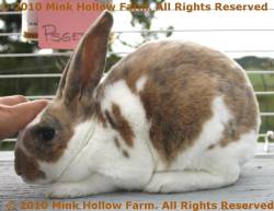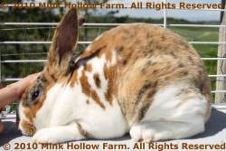 This gene is not completely recessive to E which means that a rabbit that is Eej will show some brindling. This can almost always be seen on an agouti (A-) or tan (At-) but may be hidden in a self (aa). It is easiest to see inside the ears. Notice how the brindle seems to be trying to come through as spots on the broken castor below.