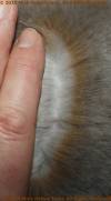 The agouti group of colours carries the original (wild) colour pattern, where the body colour comes from hairs that are banded. The tip colour is determined by the B and D genes and is black in castors, chocolate in ambers, blue in opals, and lilac in lynxs. Next to it along the same hair shaft should be a red or orange colour in the castors and ambers (the redder the better), and a lighter fawn colour in the opals and lynxes, all allowing for a bluer hue in the blacks and a browner hue in the chocolates. Farther down the hair shaft is a blue colour which should be slate in the castors and opals and much lighter in ambers and lynx. The base is a light dove grey or white. The guard hairs are typically the ones that are tipped. The surface belly colour is tan, off-white, or white again, with the dilutes having the lighter colours. The undercolour should be the same as the undercolour of the body.