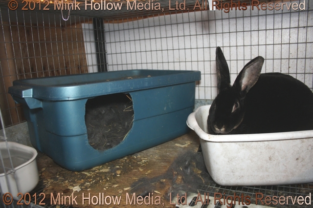 | Title: | Tote Bin Nestbox: Note that the doe has "enlarged" the opening. It is cut near the top to provide a baby-saver lip at the bottom. This helps the reduce the risk of babies getting pulled out of the box if they don't let go of the nipple... |